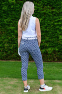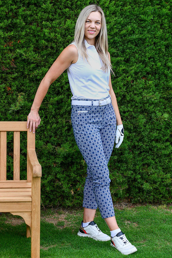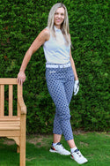 A jean inspired ladies crop pant in navy, indigo and white ikat print. With jean style pocketing, a slim leg, plus performance stretch for an easy swing. Wear long after your golf game in this go every where pant.