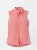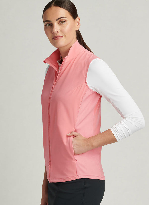A soft and quiet performance fabric anchors this lightweight wind and water-resistant vest, with an inset rib-knit at the sides for a feminine shape and additional flexibility. Designed to move freely on the course, and styled for versatility, it's an easy-to-pair option perfect for cooler days.